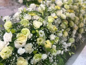 祭壇は白・黄色・グリーンのお花で清楚にまとめ、とても優しい雰囲気に。