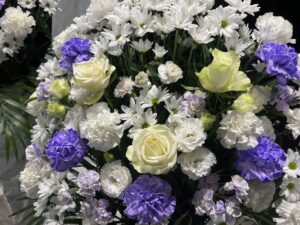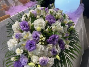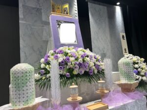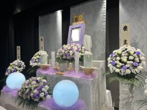 お花の祭壇は、故人様がお好きでよく育てられていたという紫のトルコ桔梗を中心にアレンジ。