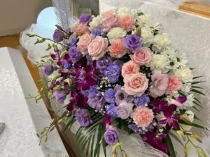 故人様がお好きだった紫の花を中心に、やわらかなピンクを添え、春の花を少し加えることで、華やかさと温かさを併せ持つ祭壇に仕上げました。