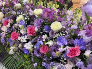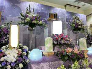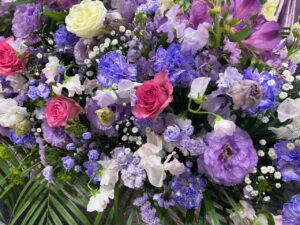 祭壇のお花には、お母さまが生前とてもお好きだったという紫の花を中心に、淡いピンクを品よく散りばめ, 全体をパステル調のやわらかな雰囲気でまとめました。紫の深みとピンクの優しさが寄り添い、故人様のお人柄をそっと包み込むような祭壇となりました。