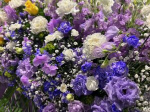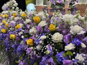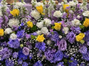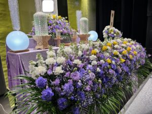 お花の祭壇は、紫のお花をメインに、ポイントとして黄色のお花を少しあしらい、落ち着きのある男性らしい印象で作成いたしました。