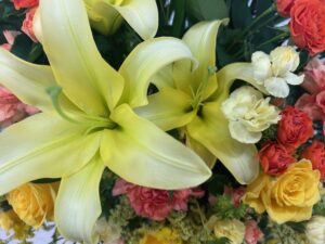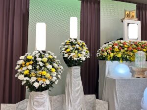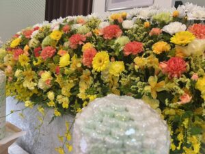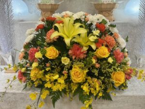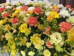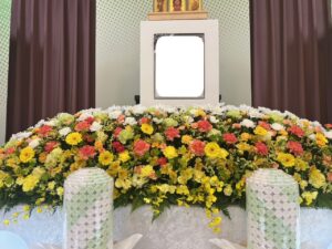 故人様は生前、明るく元気なお人柄だったとお伺いし、その想いを大切にしたお見送りができるよう、花祭壇は黄色とオレンジを基調とした明るく華やかな雰囲気でお仕上げいたしました。会場全体が温かく包まれ、ご家族様にも「故人らしいお別れができた」とのお言葉をいただきました。