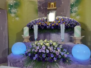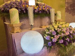 花祭壇は、故人様が生前お好きだった紫色のお花を中心に、差し色として黄色のお花をあしらい、落ち着きの中にも温かさを感じられる、品のある祭壇に仕上げました。式場に入られたご家族様が静かに祭壇を見つめ、「とても故人らしいですね」と微笑まれたお姿が印象的でした。