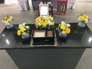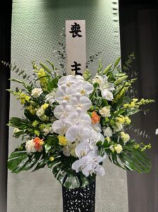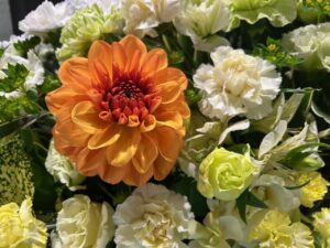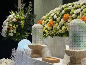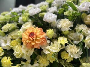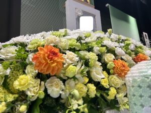 お花の祭壇は、故人様が生前お好きだった雰囲気を大切にし、淡いグリーンと白を基調に、ポイントとしてオレンジをアクセントに加えたデザインで飾り付けを行いました。優しく温かみのある色合いが式場全体を包み込み、故人様のお人柄を感じられる空間となりました。