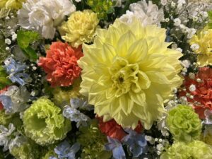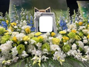 祭壇は「その人らしさ」を大切にし、故人様がお好きだったグリーン・黄色・白・オレンジ系を基調に、全体がやさしく調和するようデザインし、ポイントとしてブルーを添えることで、明るさと清らかさを感じていただける花祭壇に仕上げました。少人数での一日葬だからこそ、ご家族それぞれがゆっくりと故人様と向き合う時間を持つことができ、「無理のない形で、心に残るお見送りができた」とのお言葉を頂戴しました。