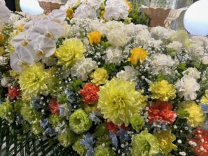 故人であるお父様は、生前とても元気で明るいお人柄だったとお伺いし、そのお姿を祭壇花で表現できるよう心を込めてご提案いたしました。黄色やオレンジを基調に、やさしさと爽やかさを感じていただけるよう薄いブルーをアクセントとして加え、会場全体が温かく前向きな雰囲気に包まれるようアレンジしております。ご家族様からも「父らしい明るい祭壇で嬉しい」とのお言葉を頂戴し、私どもにとっても印象深いお花祭壇となりました。