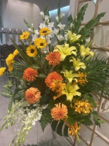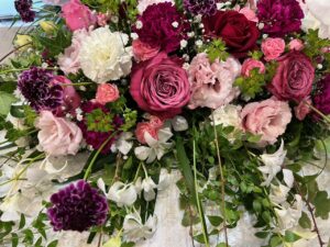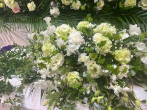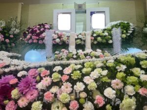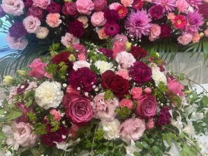 喪主を務められたご長男様のお話では、生前のお二人はとても仲が良く、いつも笑顔で寄り添いながら過ごされていたそうです。そのお姿を思い浮かべながら、祭壇にはご夫婦それぞれの遺影写真を並べてお飾りし、お二人が共に人生の卒業式を迎えられるようなイメージで、花祭壇を華やかに仕上げました。色合いや花の配置にもこだわり、ご夫婦がこれからも一緒に歩んでいかれるような、温かみのある空間となるよう心を込めてお手伝いをさせていただきました。