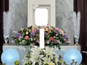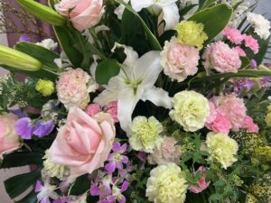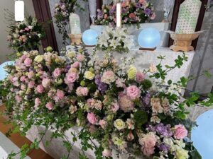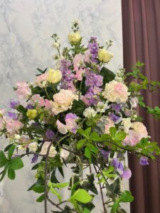 今回ご縁をいただいた故人様は、生前とても明るく朗らかなお人柄だったと伺いました。周囲を自然と笑顔にする、まさに“お母さんらしい”温かさにあふれた方だったそうです。そのお人柄を偲び、祭壇は白を基調に、やさしいピンクと紫を織り交ぜたパステル調でアレンジいたしました。柔らかな色合いの花々が式場を包み込み、ご家族様からも「母らしい雰囲気ですね」とお言葉をいただきました。